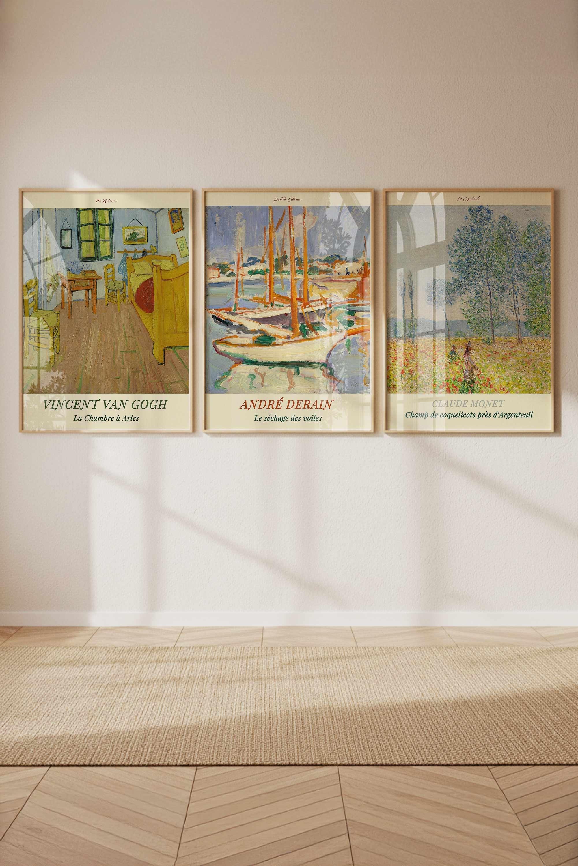 Monet, Van Gogh, Derain 3'lü Çerçeveli Tablo Seti Çerçeveli Renk Seçenekli